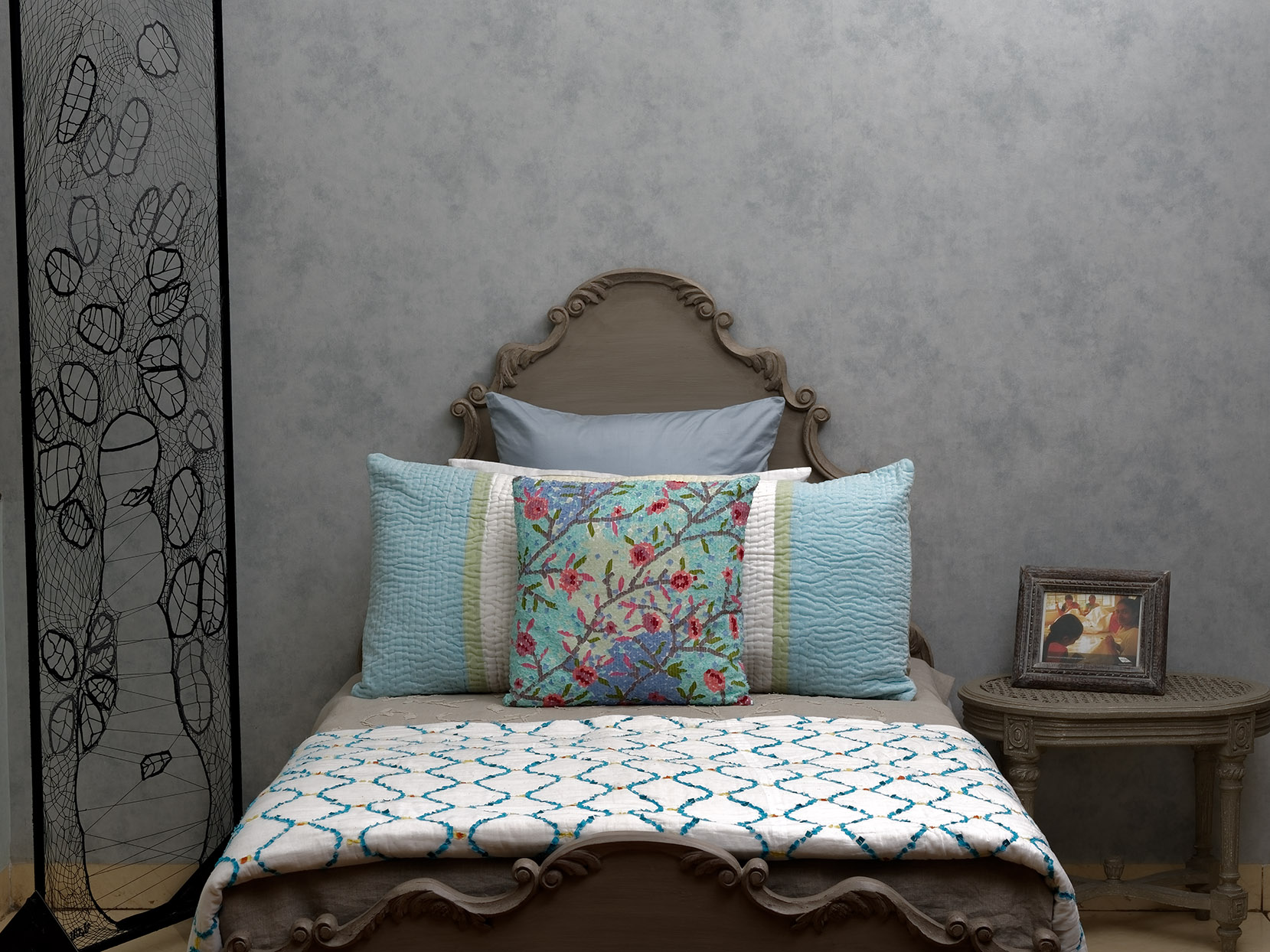 The grid pattern of the quilt is constructed with the mosaic technique. The grid has a distressed nature where it fades in certain areas. The highlights however hold the grid composition in this quilt.