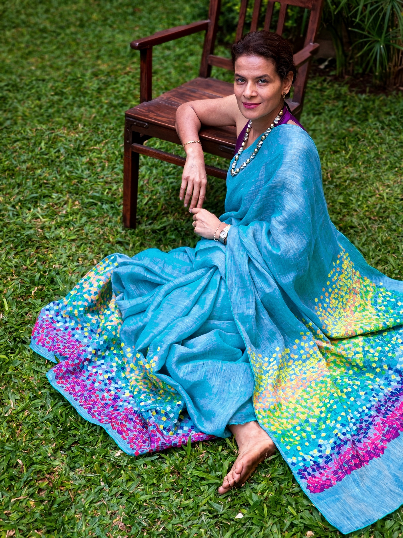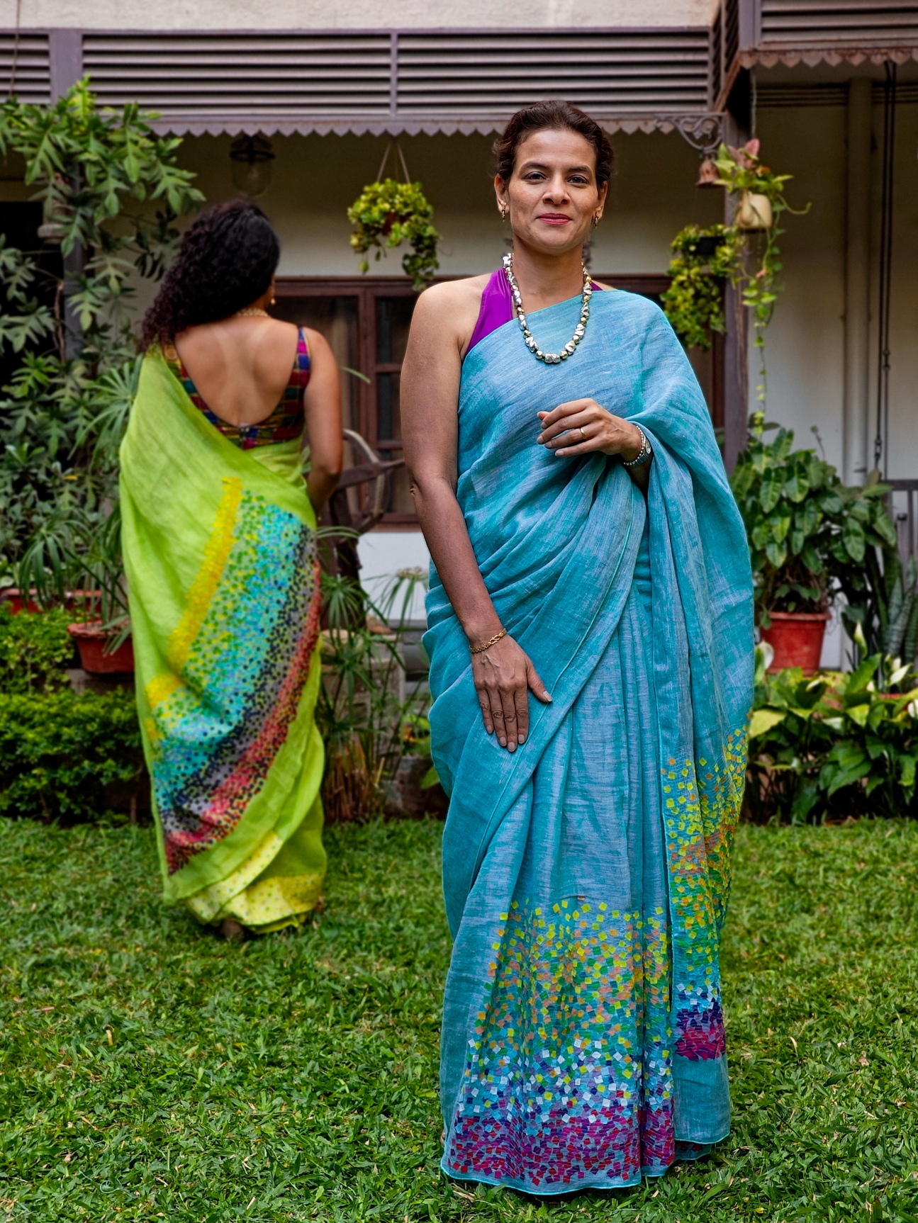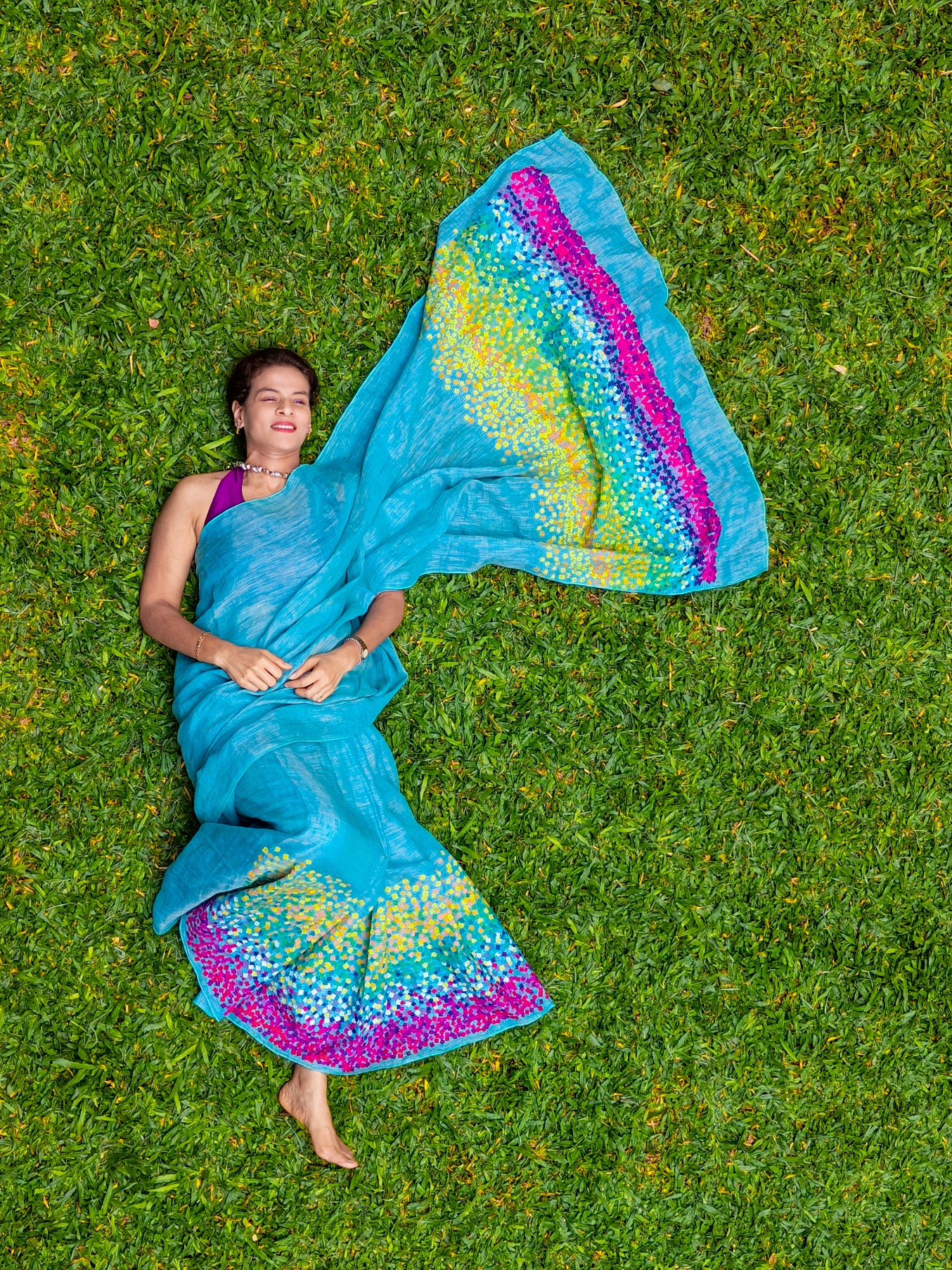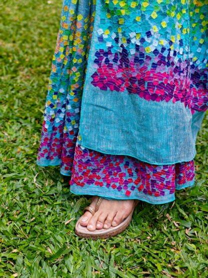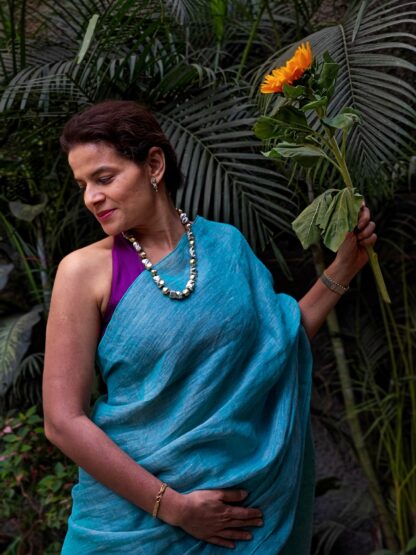 Our handcrafted blue linen saree embodies a sense of tranquility and timeless look. Saree pallu and pleats shows our beautifully handcrafted collage technique done in a gradation of number of colors. Its intricate craftsmanship reflects meticulous attention to detail. It showcases unique patterns and textures that captivate the eye. The serene shade of blue evokes images of clear skies and calm waters. Lending a soothing and refreshing charm to the saree. Linen’s lightweight and breathable nature make it a practical yet stylish choice for various occasions, from casual gatherings to formal events. Whether adorned with traditional or contemporary, a blue linen saree exudes elegance and sophistication. And thats what makes it a versatile and classic addition to any wardrobe.