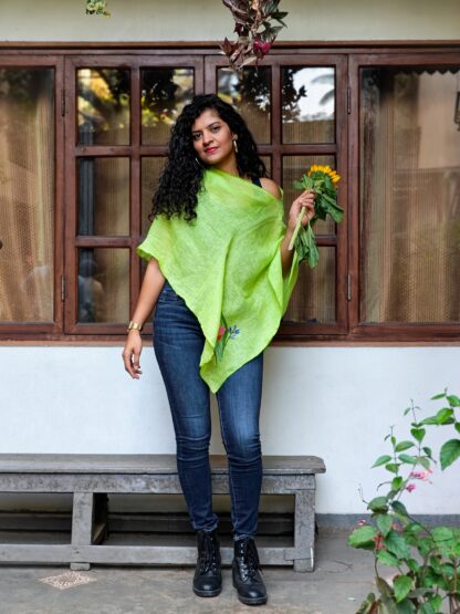 Our handcrafted green linen shrug (Mahua) is a natural and an elegant addition to your closet. The lush green color brings a touch of freshness and vitality to any outfit. Its airy and lightweight fabric ensures comfort, making it suitable for you to wear it in all seasons. The unique design allows for easy layering over dresses or tops, adding a stylish and chic element to your look. This Green Mahua is a timeless accessory that celebrates the beauty of nature and designers mastery.