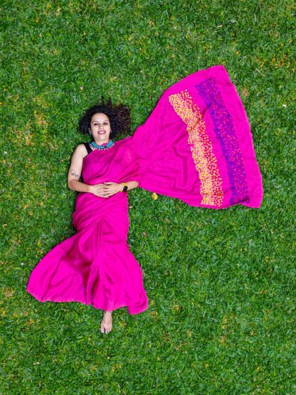 Our handcrafted pink linen saree is a mesmerizing blend of traditional elegance and modern allure. Each saree is painstakingly crafted by skilled artisans, showcasing intricate details such as our handcrafted collage technique on the pallu of saree and delicate embroidery flowing over, elevate its beauty. The bright pink hue of the linen exudes a feminine and graceful charm, perfect for enhancing your natural radiance. Its lightweight and breathable fabric ensure comfort, while its drape lends an ethereal quality to your silhouette. Our handcrafted pink linen saree is not just a garment but a work of art, celebrating craftsmanship and adding a touch of timeless beauty to your wardrobe.