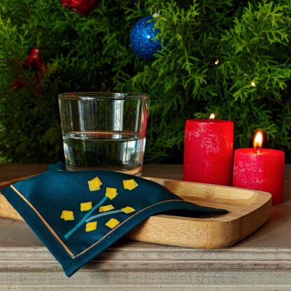 Introducing our limited-edition set of four teal cocktail napkins, designed to dazzle this Christmas! Crafted with our signature handcrafted collage fabric technique, each napkin embodies the artistry and dedication of our skilled artisans. Adorned with a festive shimmer border detail, these napkins sparkle with seasonal charm, elevating your cocktail soirées to new heights of elegance. Versatile and chic, they effortlessly complement any holiday gathering, infusing a touch of sophistication into every sip and conversation. Embrace the magic of the season with these exquisite teal-colored cocktail napkins, a harmonious blend of craftsmanship and festive allure that promises to enchant your guests and elevate the ambiance of your celebrations.
