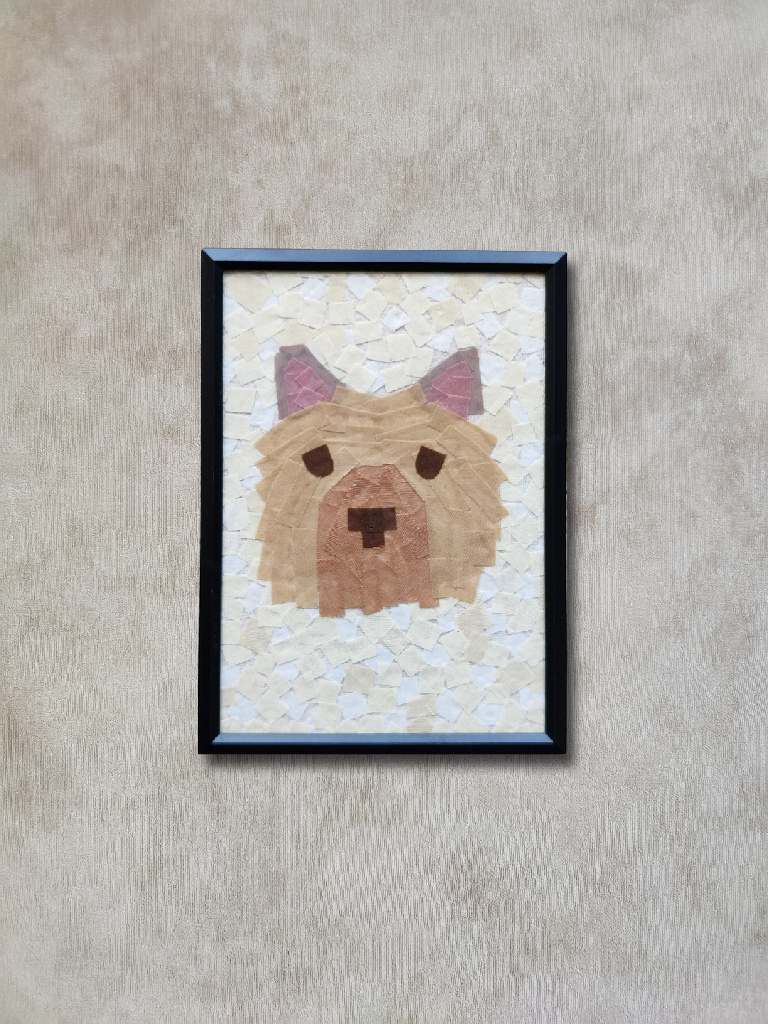 A set of dog faces textile art frames by Calyz. Handcrafted in collage technique. These frames can be used in any space as it displays a cheerful play of colours.