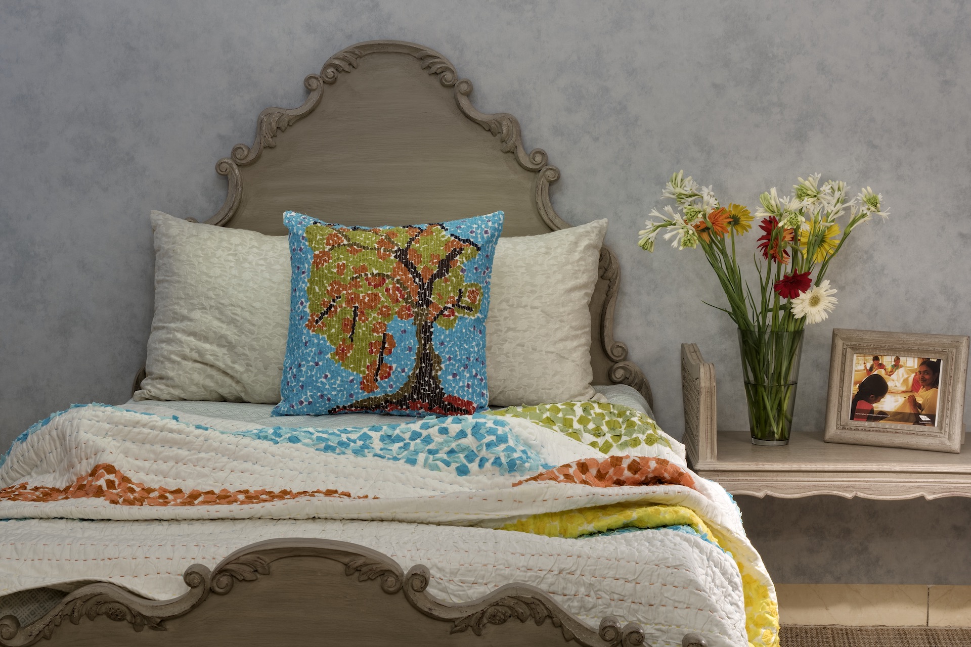 Inspired from the Gulmohar tree that blooms in Summer. The tree form is a distinct feature and the orange and red reminds us of the summer colours that are always soothing against the heat. The back ground colours elevate the tree colours to create a bold tree form. Try this with a red contrasting textural cushion.