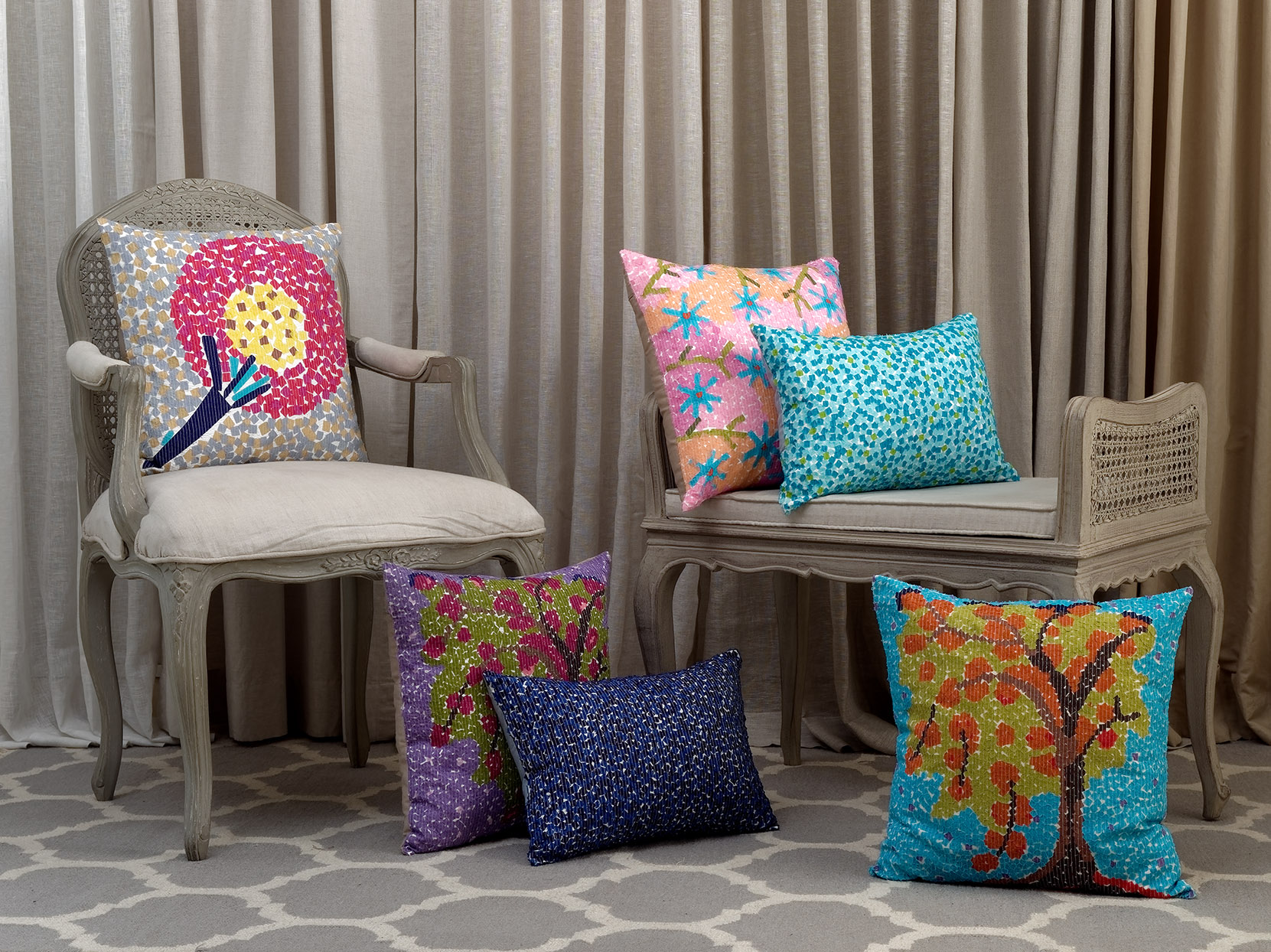 Inspired from the Gulmohar tree that blooms in Summer. Though the colours are orange this design is a colour variation for design purposes. The tree form is a distinct feature and the pink reminds us of the summer colours that are always soothing against the heat. The back ground colours elevate the tree colours to create a bold tree form.