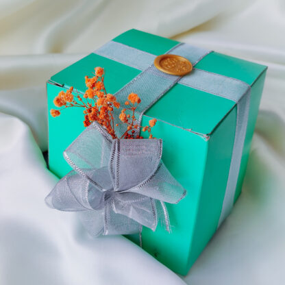 The Sea Green Box of Delight is a cute hamper with silver bow and some dried flowers and golden seal.