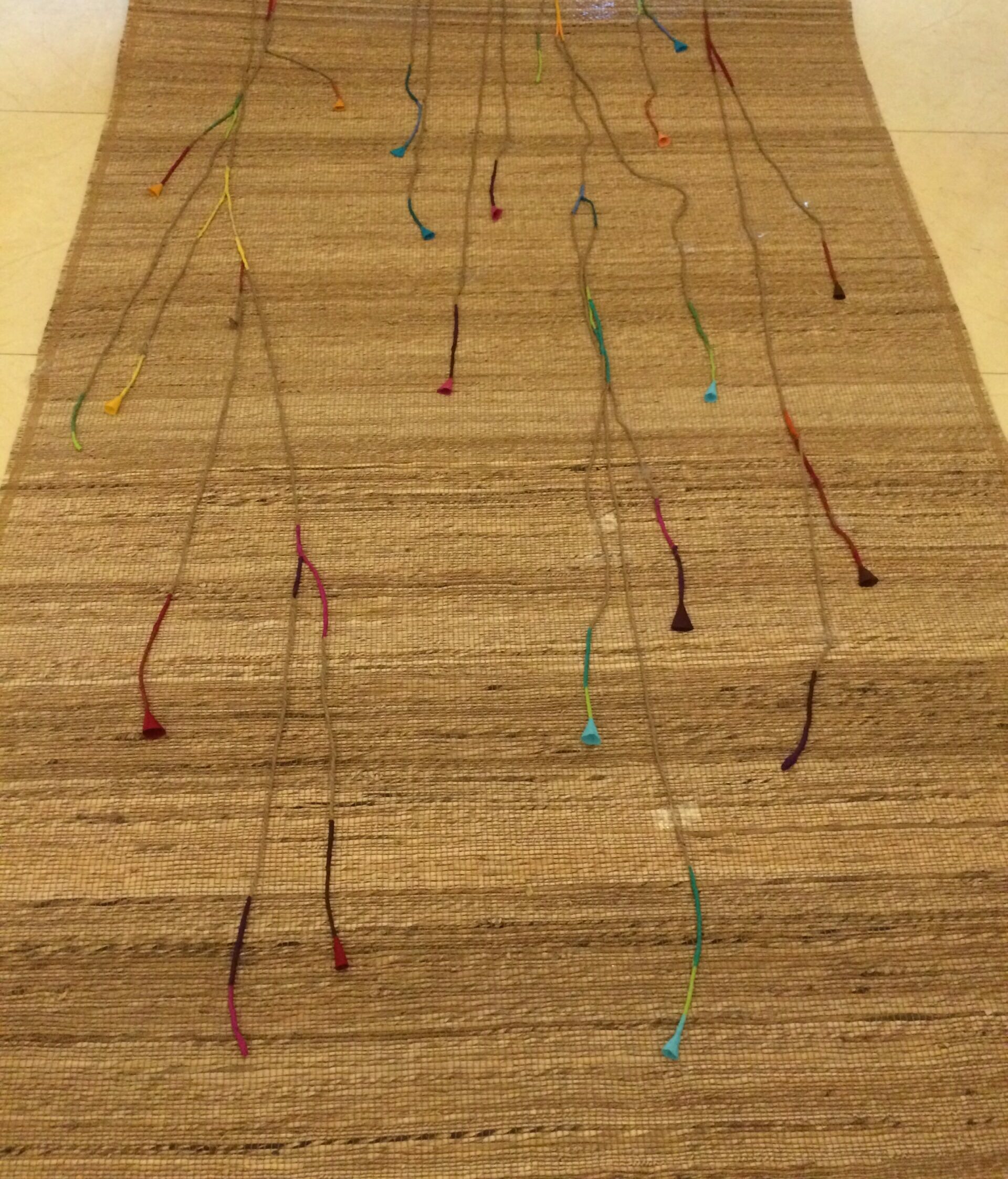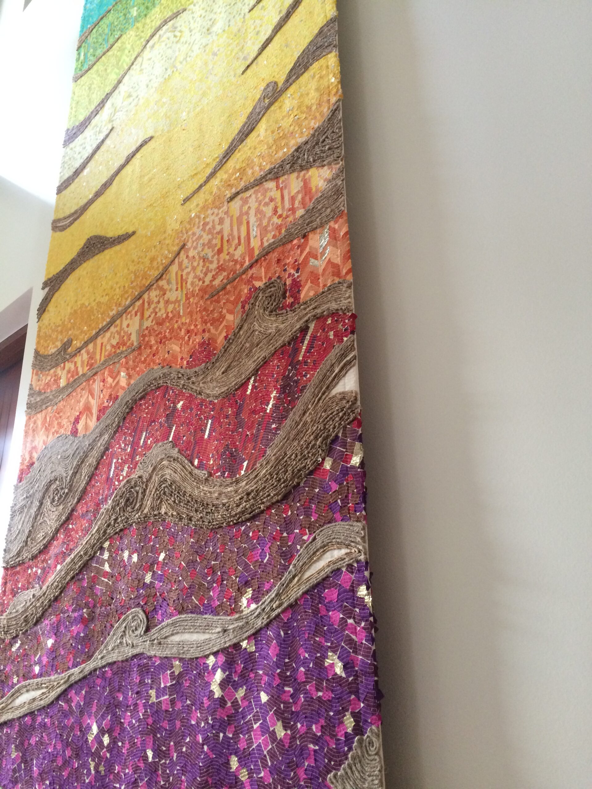 The collage fabric technique was perfect for this piece. It helped build up the gradation of colour from dark to light tones. The highlight was the central yellow part that depicted the abundance of sunshine. Something to remind us the importance of the solar power that is connected with all abundance of life and happiness. The yellow part then blends into greens and blues to depict the sky and the completeness of life.The vibrant colours were intermingled with coarse textures of the bark by the use of jute and silk. The coarseness of silk complimented the wave forms and added a wonderful contrast. The mosaic pieces were sewn down with a wave stitch. The entire piece has a banana fibre backing for it to hang straight and flat. The reverse of the piece is also embellished with and element of prop roots with jute strings covered in fabric ending with a tassel.